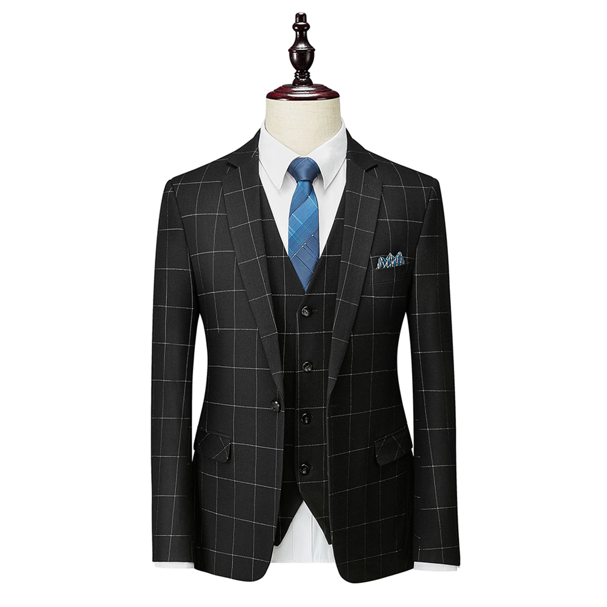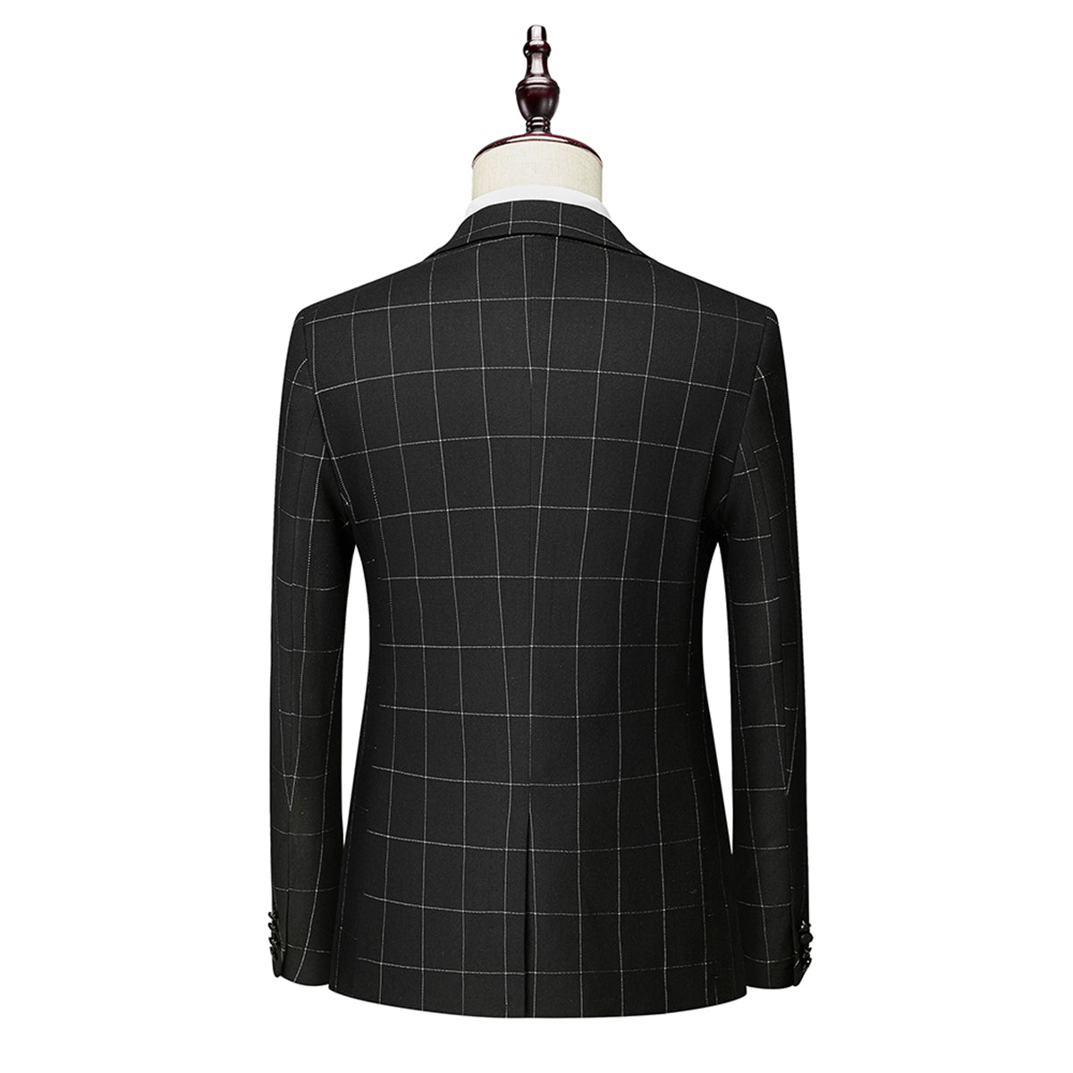 Este traje de tres piezas con diseño a cuadros está pensado para quienes buscan un estilo formal con un toque moderno. Su corte ajustado realza la figura y lo convierte en una opción excelente para bodas y ceremonias. El conjunto consta de chaqueta, corbata y pantalones, lo que ofrece un look elegante para cualquier ocasión especial.